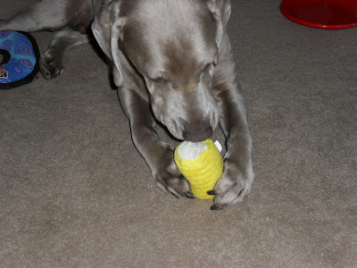 We came home on this Tuesday after being gone most of the day, the dogs greeted me with the usual jumps and barking like I 'd been gone forever, Jake and Elvis like to greet with toys in their mouth. Jake ran to the back porch to get his treasure for me.